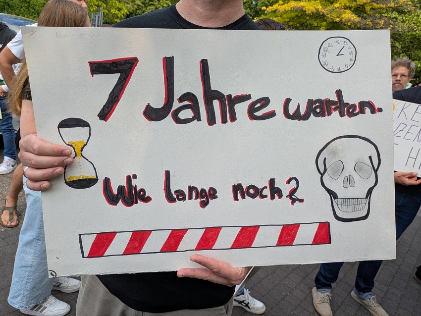 Über 200 Lehrer*innen, Eltern und Schüler*innen haben am Dienstag, den 20.05.2025, vor dem Rathaus der Stadt Bornheim für den Neubau der HBG demonstriert.